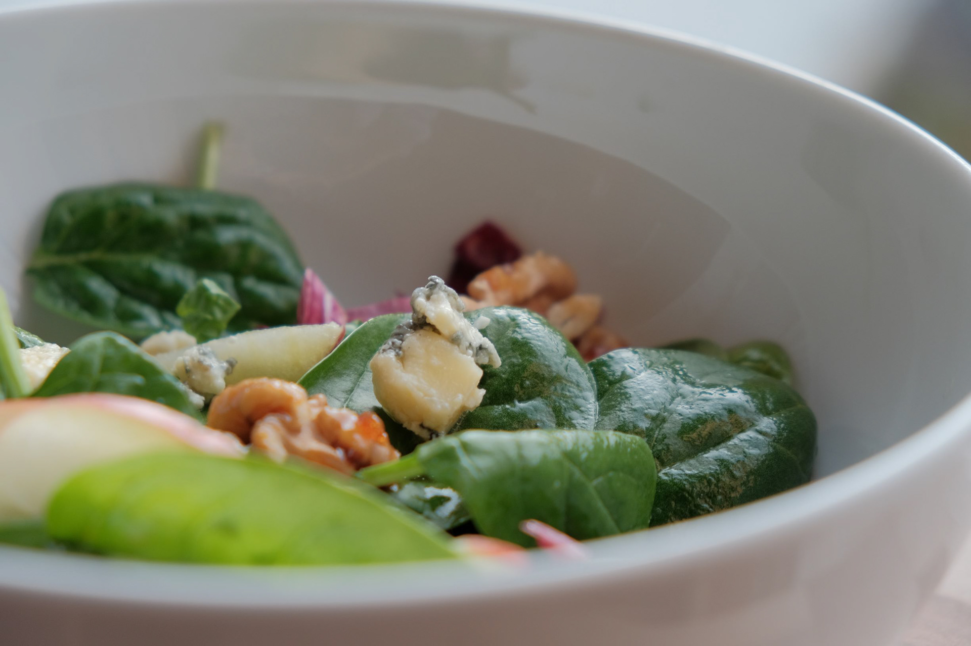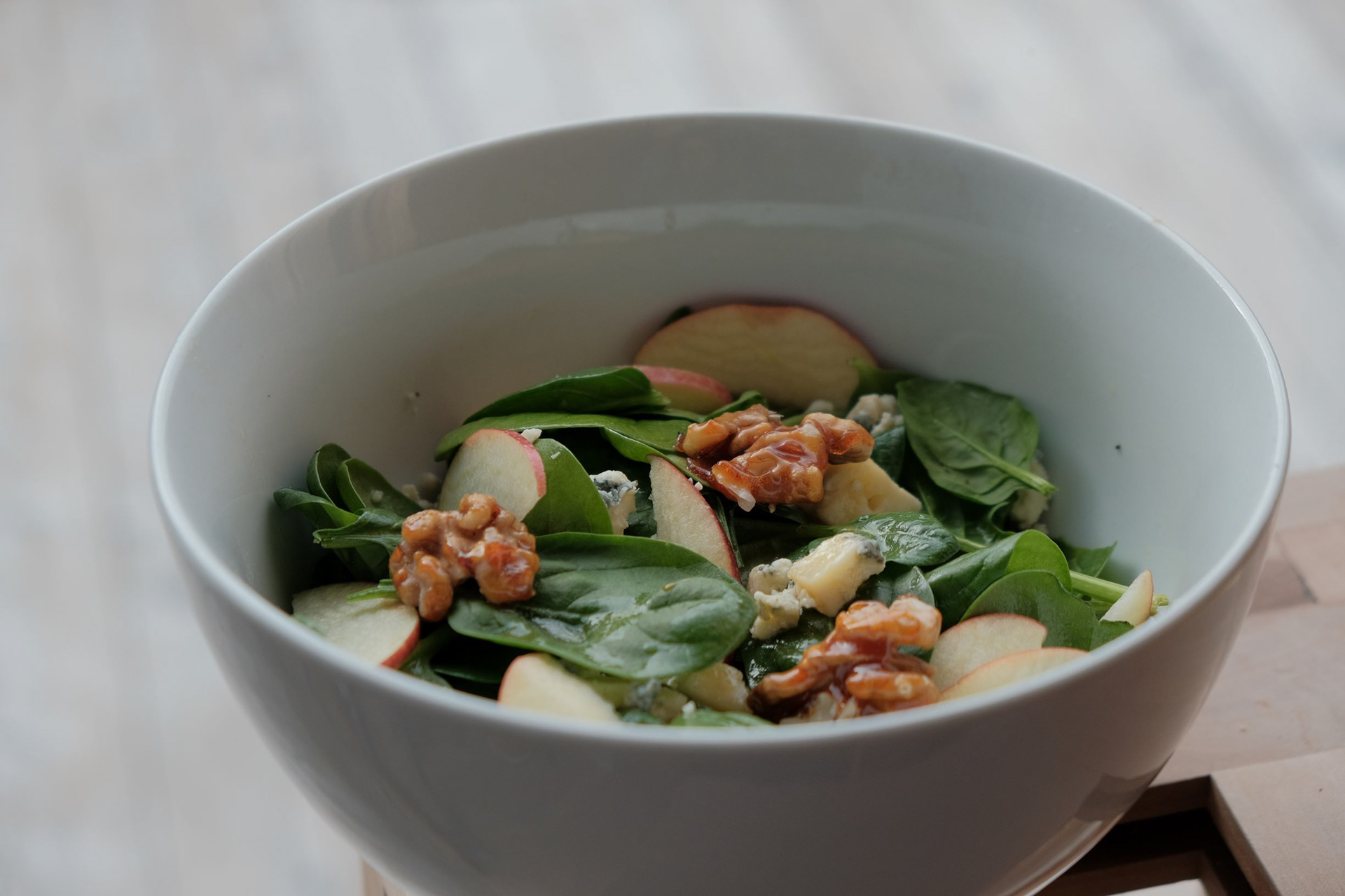 Lavare i spinaci, tagliare il blu a pezzeti piccoli e la bera in fete sottile. Per la vinagrette fare miscolare tutti ingredienti insieme con la frusta. Guarnire l'insalata e versare i noci caramellate. Pronta l'insalata primavera!