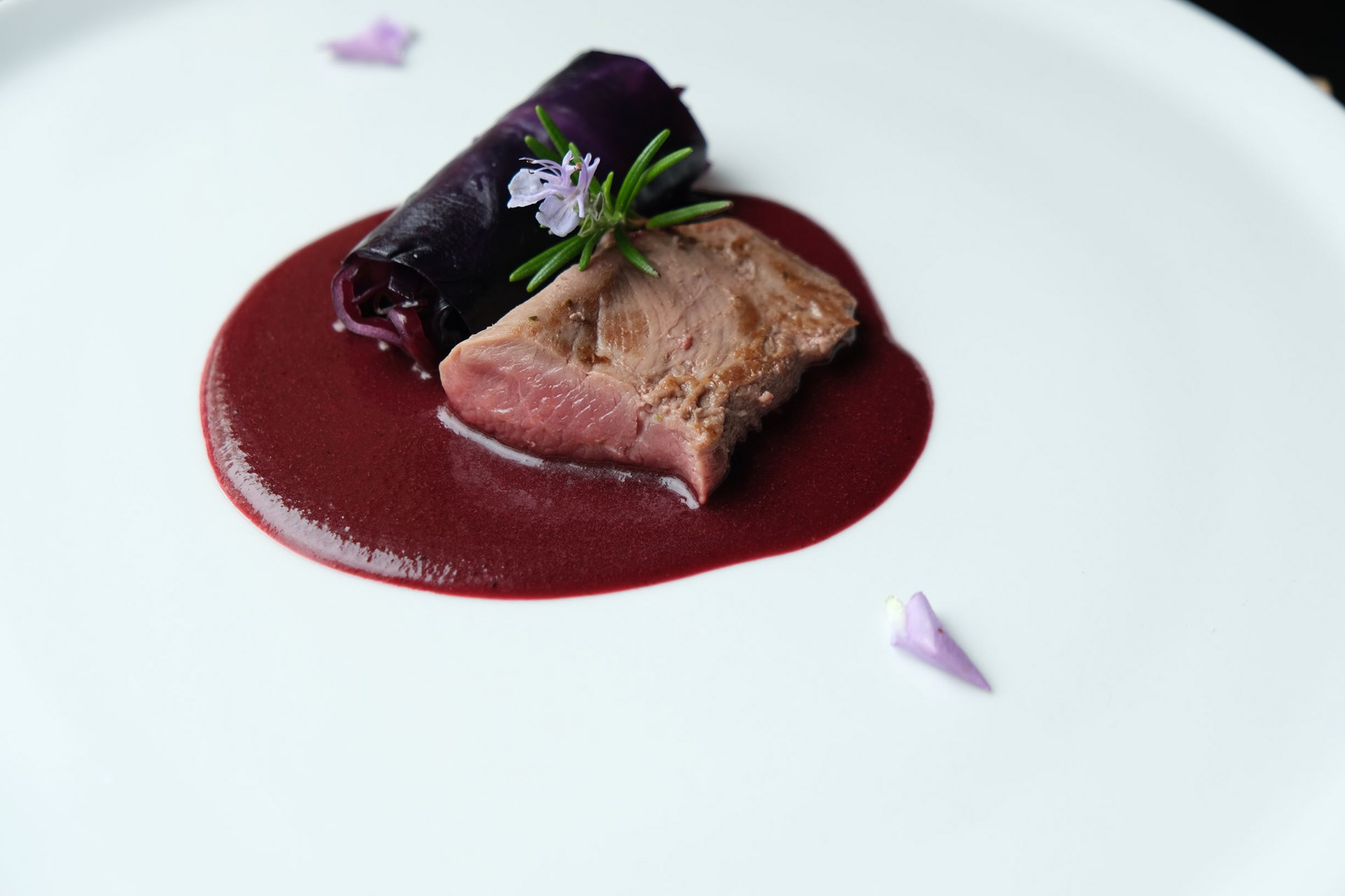 Sauce pürieren und binden wenn nötig. Abschmecken. Rotkohlblätter mit Öl garnieren, mit dem Rotkohlsalat füllen und einrollen.