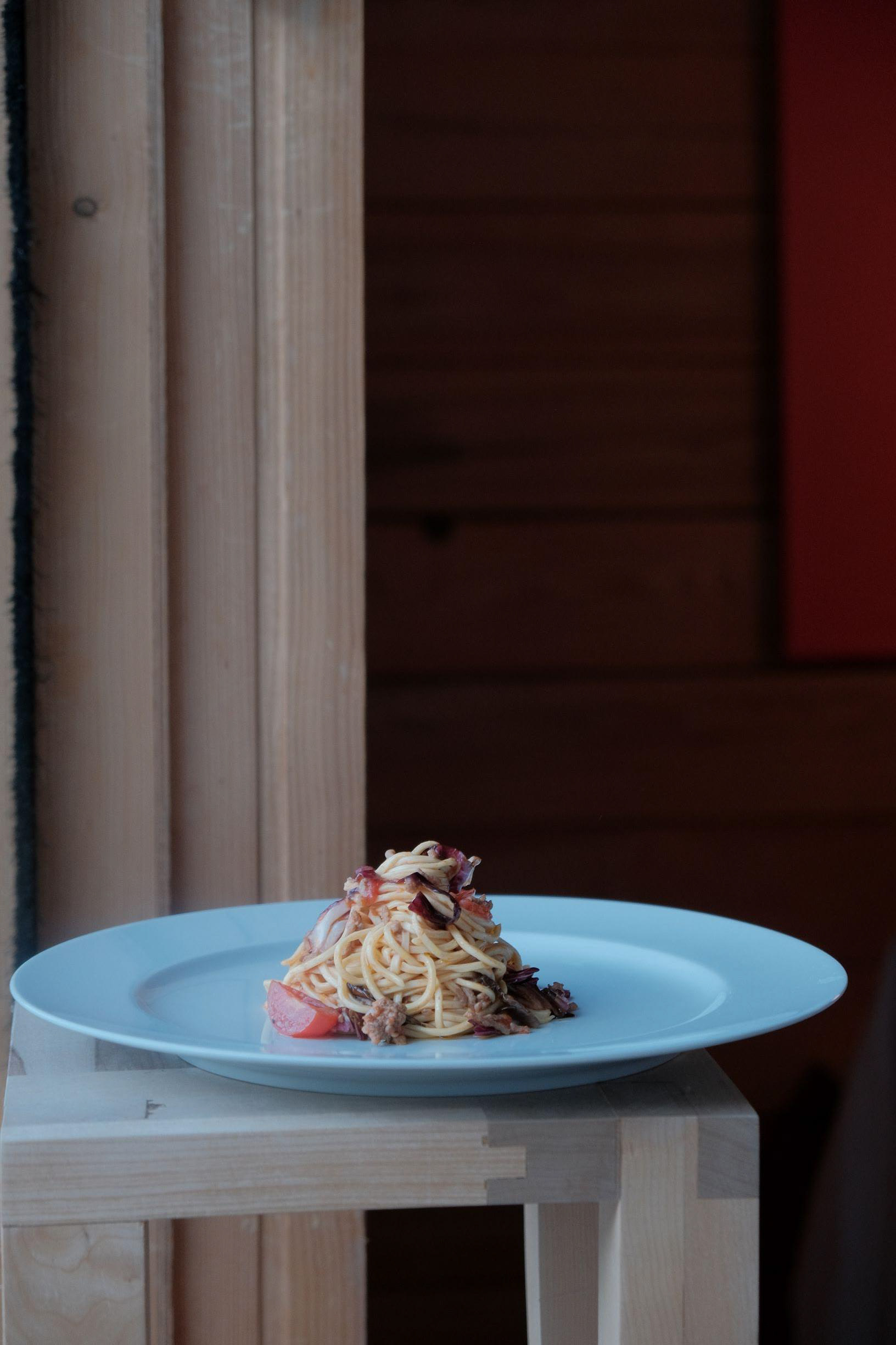 Mettere gli spaghetti, il radicchio e il sugo insieme e fare cuocergli insieme per un minuto.