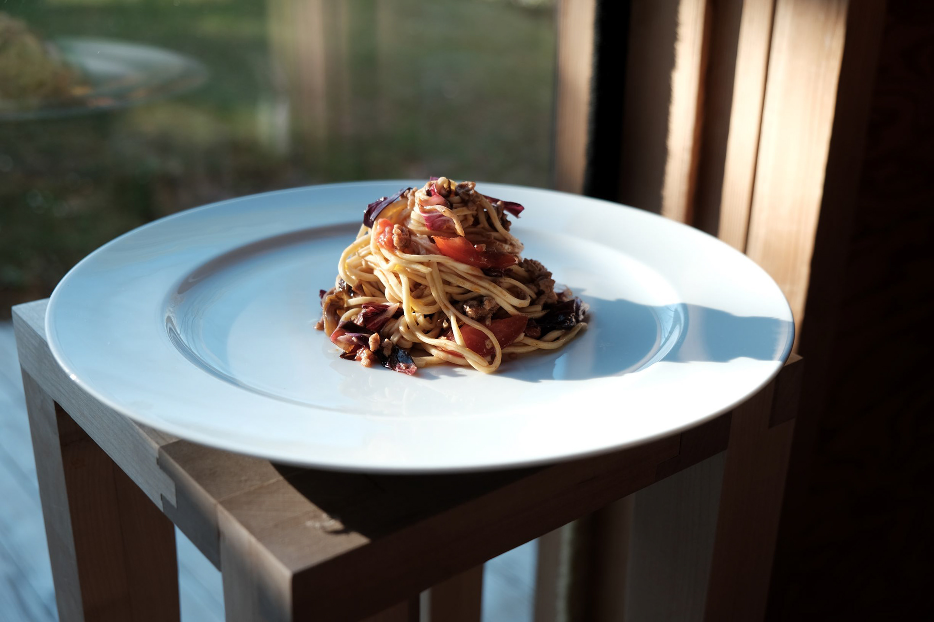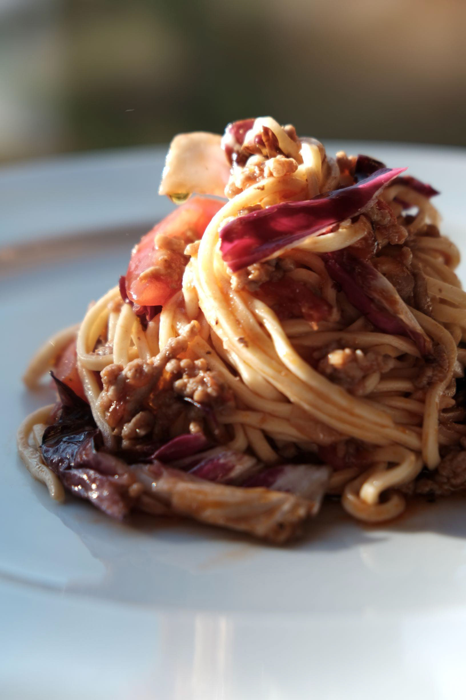 Spaghetti abtropfen lassen und zusammen mit dem Radicchio und den kleingeschnittenen Tomaten zum Sugo geben und noch 1 Minute mitkochen. Abschmecken.