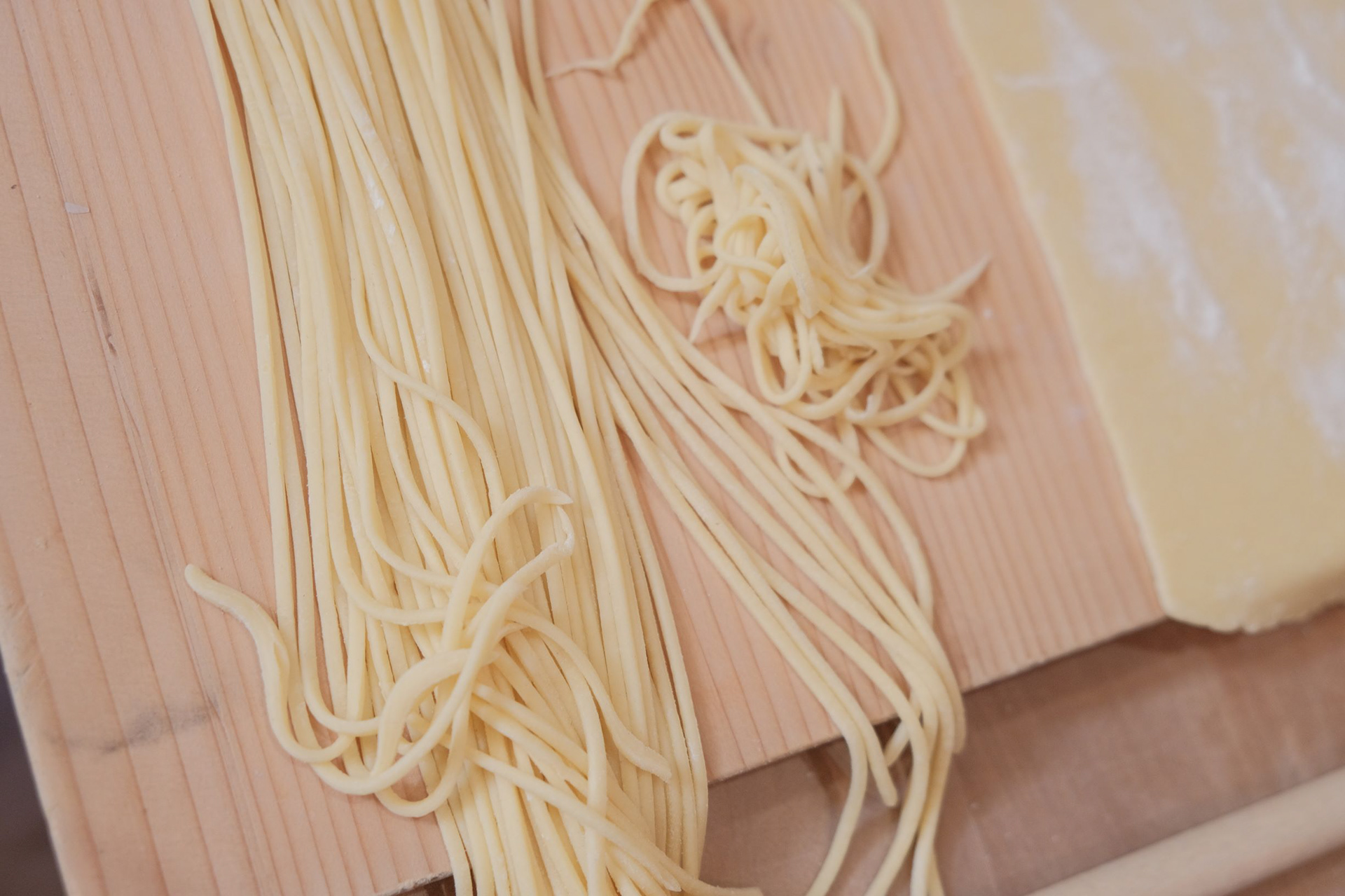 Salare e pepare il sugo. Stendere l'impasto della pasta fresca con la macchina da fare pasta e tagliatela come spaghetti. Fare cuocergli per 3-4 minuti in acqua salata.