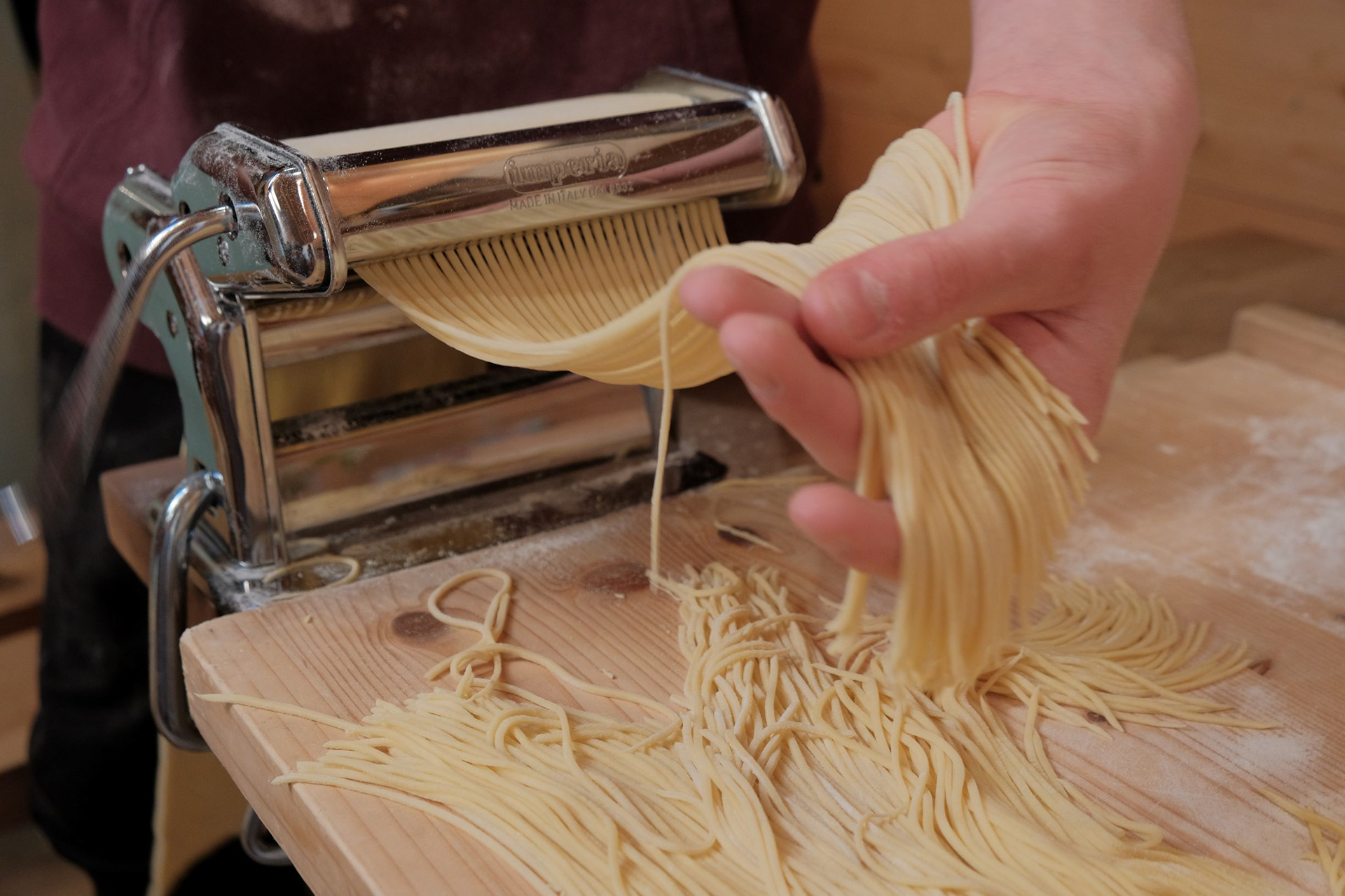 Den Teig mit der Pastamaschine auf die vorletzte Stufe ausarbeiten, dabei bei jedem Durchgang die Teigplatten mit Mehl bestäuben, dass der Teig nicht zusammenklebt.