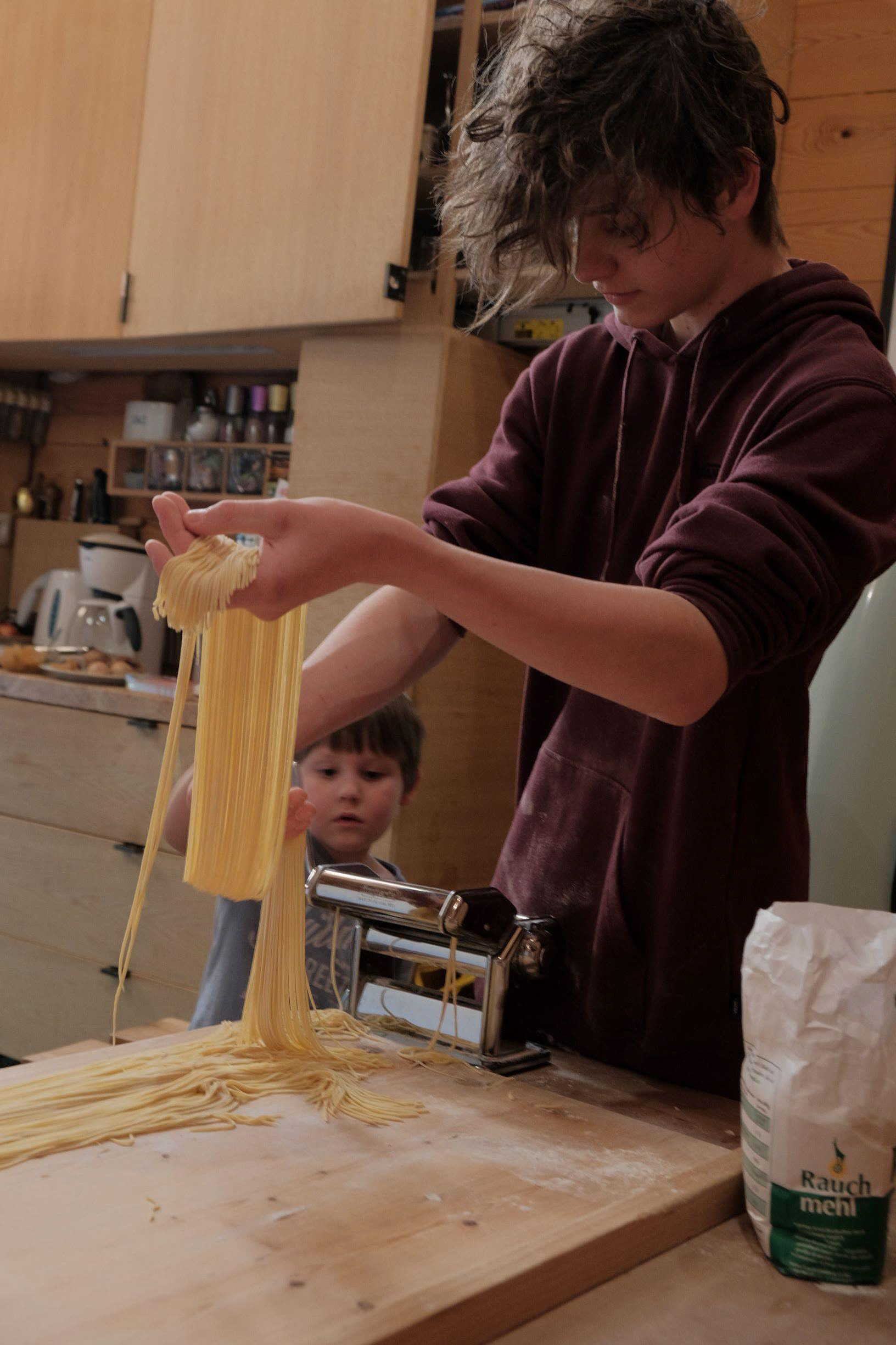 Sugo abschmecken. Den Teig durch den Spaghettiaufsatz passieren und dann die Spaghetti direkt in das kochende, gut gesalzene, Wasser geben. Die Spaghetti haben eine Garzeit von circa 3 bis 4 Minuten.