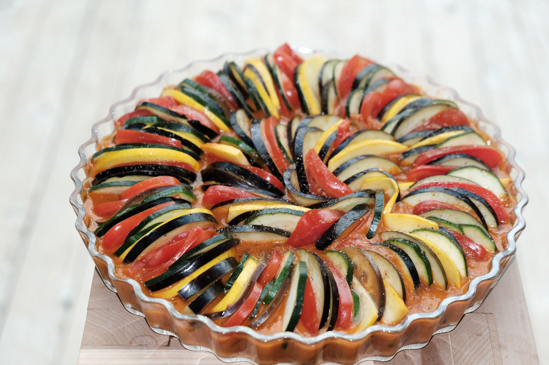 Befülle eine Tart\Auflaufform mit der Soße und schlichte das aufgeschnittene Gemüse in Form einer Spirale bis zur Mitte. Salzen und Pfeffern.