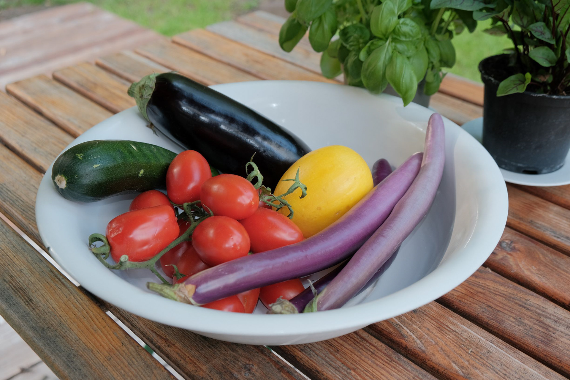 Tagliare a copetti la cipoletta, l'aglio e il pezzo di sedano. Lasciarli andare coperti nel olio d'oliva per 10 minuti. Tagliare i zucchini, la melanzana e 250g dei pomodori a fette fine. Gli avanzi delle verdure piu 250g pomodori aggiungere nella padella con sale, pepe e un po' di timo. Cuocere per 10 minui ancora. Aggiungere un goccio d'olio. basilico fresco e frullare tutto insieme. Se la salsa e troppo acciutta aggiungere un po' di acqua.