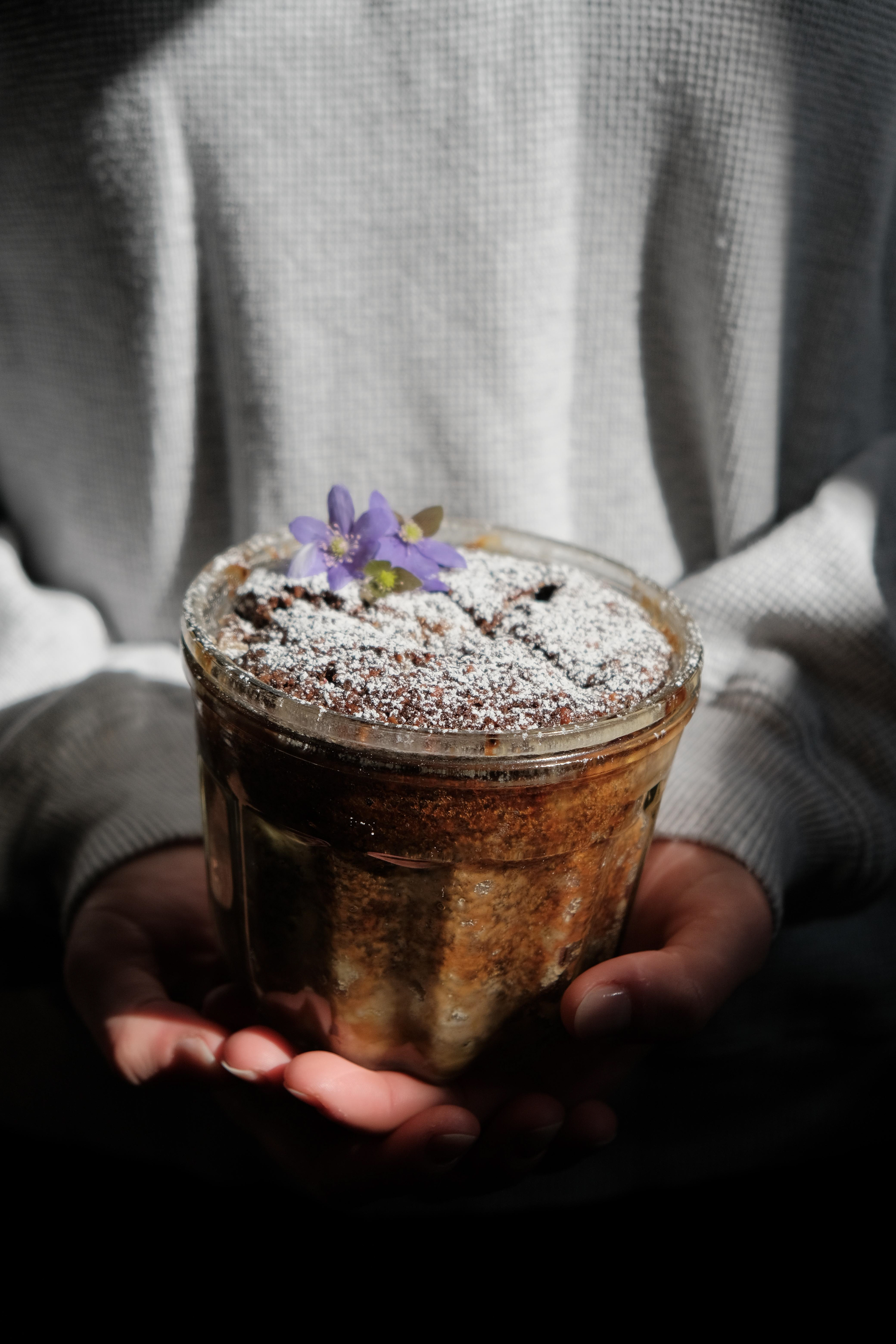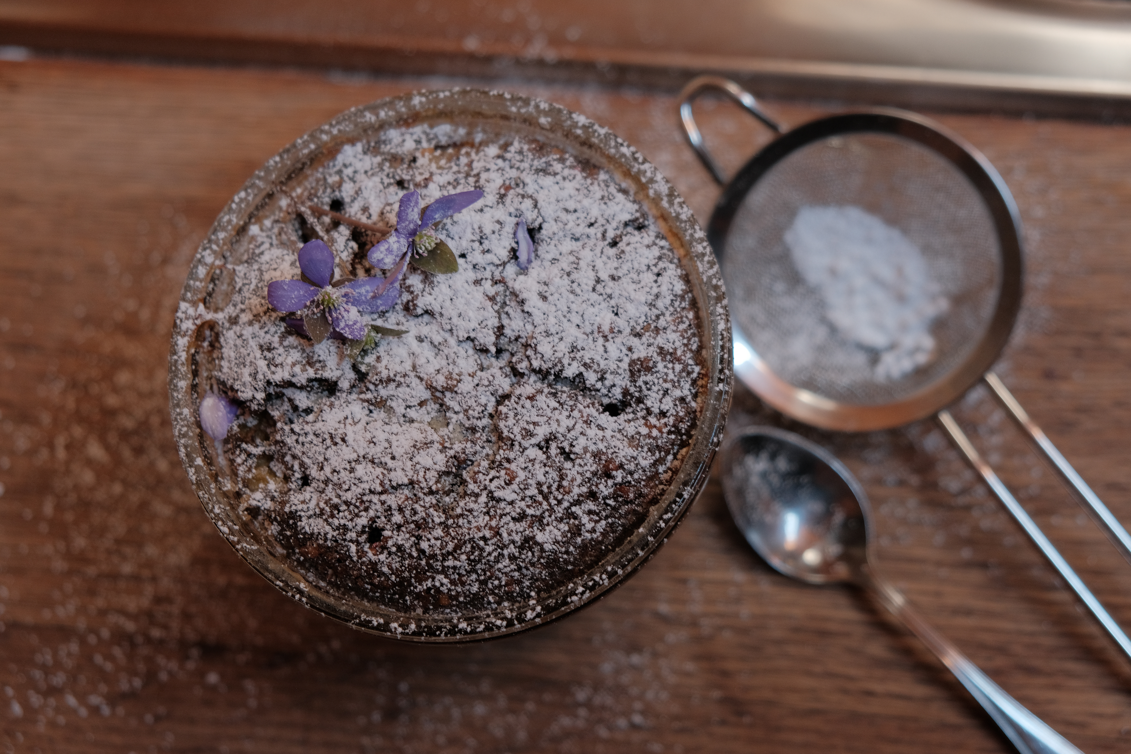 Eine kleine Form ausbuttern (circa 18 cm) und mit braunem Zucker oder Mehl einstäuben. Bei 180 C° 20 Minuten backen.