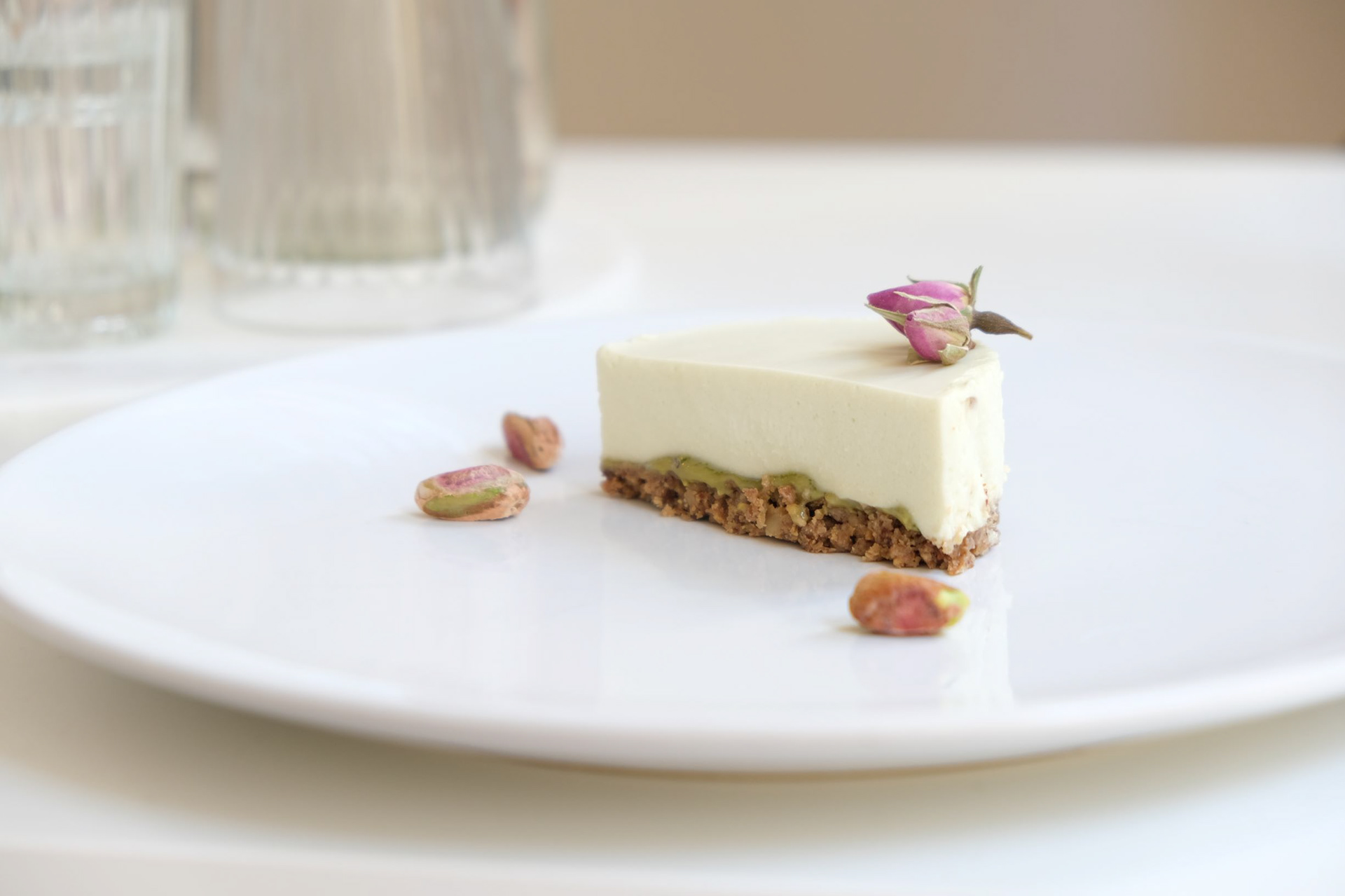Den Boden mit Pistazienmousee bestreichen, Fülle einfüllen und im Kühlschrank für mindestens 4 Stunden fest werden lassen. Mit getrockneten Rosenblüten und Pistazien garnieren.